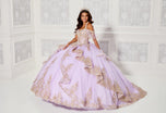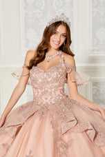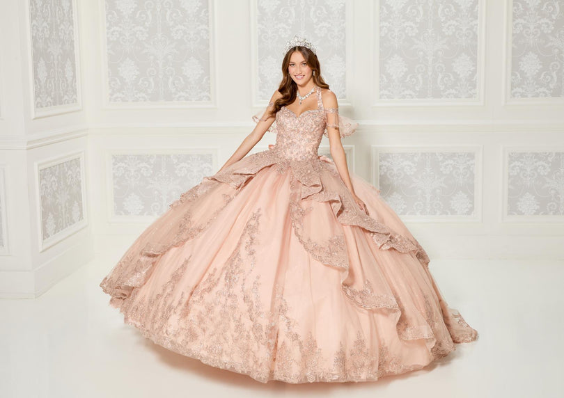 The fabric in this Princesa by Ariana Vara Quinceanera dress is Embroidered Lace, Glitter Tulle, Beading, Stone Accents . Detachable ruffle sleeve