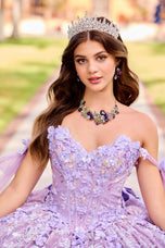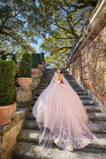 The fabric in this Princesa by Ariana Vara Quinceanera dress is Cracked Ice, 3D Flowers, Sequins, Heat Set Stones, Tulle, Pongee Lining. Detachable Shoulder Straps with Sash, Detachable Train, Back Modesty Panel Included