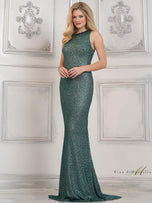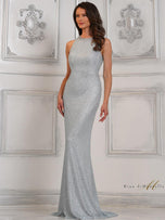 Shine bright like a diamond in this unique evening gown designed by Rini Di Montella, style RD3140. This metallic evening dress is decorated with rhinestone beadwork that features a jewel neckline, cut-in sleeves, and a full zip-up back. This stunning formal gown with a form-fitting silhouette is complete with an elegant train that will sway beautifully with every step that you take.