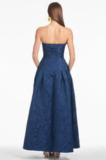 Elegance meets artistry in the Sachin & Babi "Belle" Dress—a breathtaking choice for any formal occasion. This strapless masterpiece features a luxurious brocade fabric adorned with multi-colored embroidered flowers, creating a romantic and sophisticated look. The A-line silhouette gracefully flatters the figure, while pleats at the hips add structure and movement. Designed with an empire waistline, this gown elongates the frame for a regal, timeless appeal. Step into effortless glamour and be the best-dressed guest in the Belle Dress by Sachin & Babi.