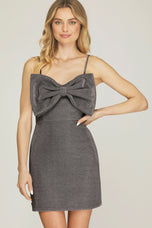 Step into the spotlight with this She + Sky Bodycon Mini Dress with Big Bow Front Detail, the ultimate statement piece for any night out. Crafted from sparkly fabric, this dress catches the light from every angle, ensuring you shimmer and shine wherever you go. Designed for an effortlessly flawless fit, this dress features adjustable spaghetti straps that allow you to customize your look and comfort. The large bow detail at the neckline adds a trendy touch, making it the perfect blend of fabulous and fun. With its empire waistline, this dress accentuates your silhouette, while the fitted skirt hugs your curves, creating a stunning, figure-flattering shape. Whether you're heading to a party, a date, or a special event, this dress is your go-to for turning heads. It's trendy and affordable, making fashion accessible without breaking the bank. Elevate your wardrobe with this must-have piece that combines style and sparkle with ease! Get ready to dazzle and delight in this striking She + Sky mini dress – your new favorite for any occasion!