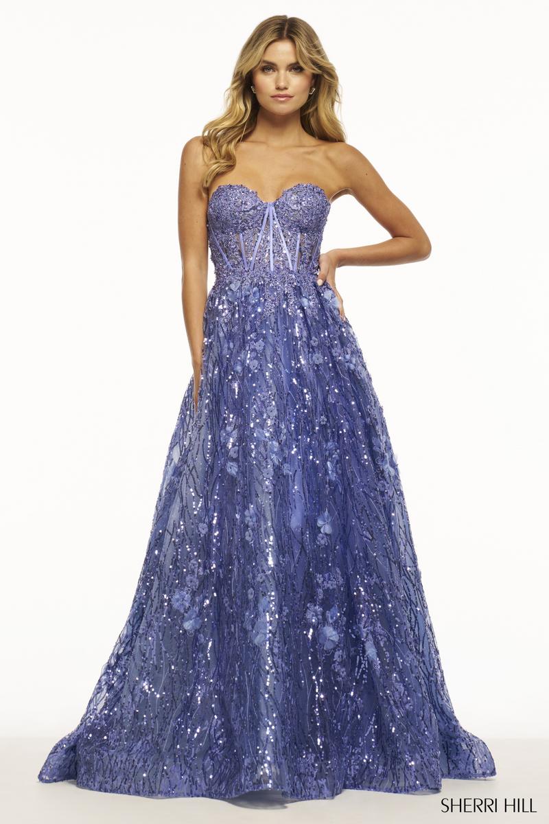 Float Across the Dance Floor in Sherri Hill Prom 2021 style 54305. This full length gown has a strapless sweetheart silhouette. The bodice is sheer with exposed boning covered with soft lace applique. The ballgown skirt has 3D appliques on sequin sparkle tulle. Wear this dress for Prom, School Dance, or any Formal Event!