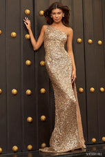 We are in love with this one-shoulder long sequined prom dress by Sherri Hill! Sherri Hill style 54470 is a one-shoulder fully sequined beauty! This long evening dress features a fitted bodice with one shoulder neckline! A fitted skirt with a thigh-high slit is accented with a sweep train! Wear as a prom dress, evening dress, and more! Check out the sister style: Sherri Hill 54330