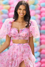 This two-piece Sherri Hill gown is just breathtaking! 55547, is from 2023 Spring Collection that will definitely have you on the latest trend. The fitted top showcases a sexy v neckline with fun puff cap sleeves, all in sweet floral print that will have you ready for spring. The lovely skirt is designed with layered of chiffon ruffles and a sexy thigh-high leg slit! Perfect for night-out, guest of and much more!
