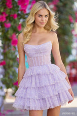 We cannot get enough of this strapless mini dress by Sherri Hill! The sheer bodice has a unique neckline with pleats and a slight dip in the strapless design. Corset boning adds interest to the dress which is made of sequined tulle and covered in fun pearls! The skirt has tiered, gathered tulle layers that are sure to be a hit as you move across the dance floor. Wear for homecoming, school dance, and other semi-formal occasions!