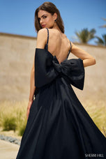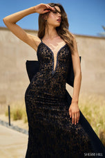 Channel all the old Hollywood vibes in this amazing Sherri Hill dress, style 55937! The long column gown features a plunging illusion neckline complete with black crystal beadwork that leads into two thin straps. The gown doesn't lack texture, constructed of shimmering black chantilly lace over nude lining. The definition of business in the front, party in the back, this sophisticated gown turns trendy with an oversized taffeta bow creating a train in the back. Complete with a side slit for easy mobility, this stunning Sherri Hill dress has it all!