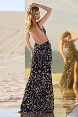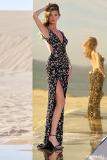 A cult classic silhouette is back and bolder than ever in a stunning new beadwork pattern, Sherri Hill style 56671 packs a punch! This fully beaded gown comes exclusively in a Black/Gold/Gunmetal colorway, taking advantage of the metallic trend that is so hot right now. The plunging v-neckline allows you to show off your stunning dcollet, while the fully open back adds a sexy yet sophisticated touch. Complete with a thigh high slit, Sherri Hill style 56671 will ensure every bead catches the light, and every glance turns your way. Whether you're aiming to be crowned Homecoming Queen, make a statement at prom, or shine in your next pageant, this cult classic silhouette is your ticket to unforgettable glamour.