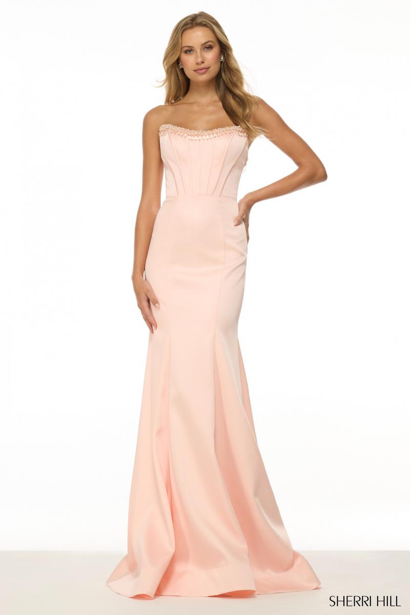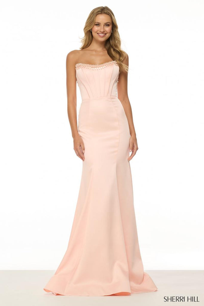 Clean, classic, and elegant in its simplicity, you can't go wrong with Sherri Hill style 56941! The stunning strapless corset bodice is adorned with a single row of pearls and beads that beautifully embellish the neckline, while the lace up back ensures the waistline stays perfectly snatched. The fitted skirt accentuates all the right curves in all the right places and is finished with a horsehair hem, which gives it the perfect shape. Whether you're headed to prom 2025, a college formal, gala, or charity event, you'll exude an unmatched elegance in Sherri Hill style 56941!