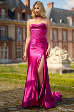 *Adds to Cart* Sherri Hill style 56969 will have you looking and feeling like the it-girl you are! The strapless corset gown features a modified sweetheart neckline with satin crumb catcher detail over slinky stretch satin skirt, complete with flattering ruching at waist and bum, high slit, and horsehair hem for the perfect shape. The corset bodice is elegantly embellished with lace appliques and exposed boning that draws the attention to the smallest part of your waistline. The crowning detail is the trendy matching lace choker with satin rosette embellishment which completes the look. From prom 2025 to an upcoming college formal or gala, Sherri Hill style 56969 is a perfect choice to make you feel sleek, sexy, and right on trend!