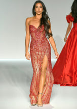 Go glam in this stunning long beaded prom dress by Sherri Hill! Sherri Hill 57065 is a stunning long beaded prom dress by Sherri Hill. The moment you walk in the door at prom, all eyes will be on you in this strapless long prom dress! The fitted strapless sweetheart bodice is accented with stunning elegant beaded sequin detail in a lattice pattern. The long prom dress skirt is adorned with linear rows of sparkling sequins and a high slit for added movement when you walk along the dance floor! The pictured color is nude/red/fuchsia. We love this as a prom dress, pageant dress and more!.