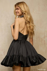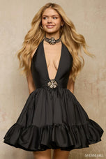 \Get set to steal the spotlight and have an absolute blast in Sherri Hill 67064, a short halter cocktail dress that's as fun and flirty as you are, making it the ultimate choice for your next big homecoming dance or any chic cocktail party! This dress is designed to make a splash, starting with its ultra-chic halter neckline that dramatically plunges into a bold deep V-neckline, ensuring all eyes are captivated by your dazzling presence. But the glam doesn't stop there! The bodice is richly adorned with exquisite beaded rosette embellishments, adding a touch of sparkling, dimensional charm that will shimmer under the disco ball or event lights. As if that wasn't enough to make you feel like a star, this fabulous dress comes complete with a matching choker, effortlessly pulling your whole dazzling look together with a touch of high-fashion flair. And for that final burst of playful elegance, a voluminous taffeta ruffle hem adds sassy bounce and movement, making it absolutely perfect for twirling the night away on the dance floor at homecoming or mingling with style at any sophisticated gathering. Whether you're aiming to be the belle of the ball at homecoming or the life of the party at a cocktail event, Sherri Hill 67064 is your go-to for fun, flirty, and unforgettable style!