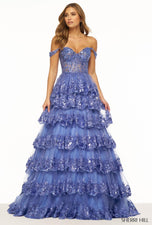 Stay on trend with this 55500 inspired off-shoulder corset dress! Sherri Hill style 56196 is a whimsical lace A-line gown featuring a sheer bodice, off the shoulder straps, and tiered skirt. Sequin lace trim sparkles from the tiered layers in every spotlight! Did I mention that this comes with a lace-up back for the perfect fit?! Sherri knows how to make you pop out in style! Wear this Gown for you Prom, Senior Celebration, or any Formal Event!