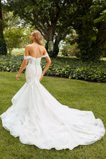 The fabric in this Sophia Tolli wedding dress is Sequined Schiffli Lace Applique, Misty Tulle, Glitter Tulle includes Detachable off-the-shoulder straps included