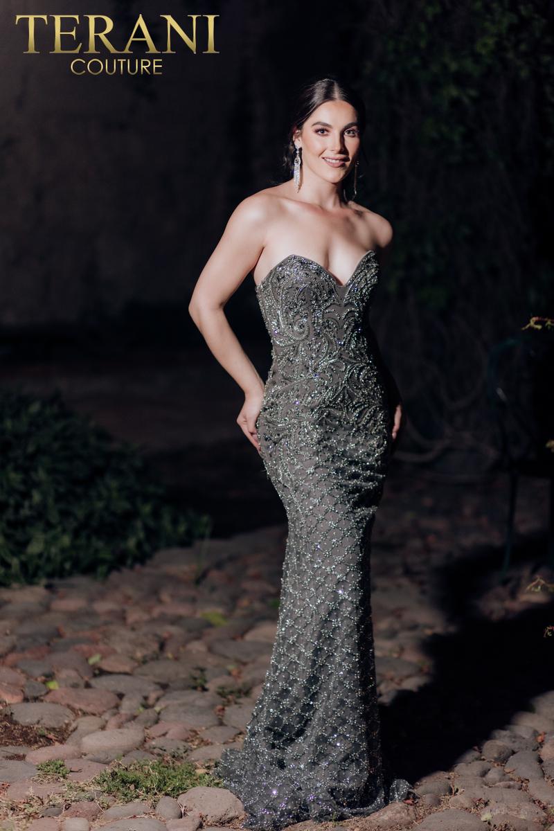 The fabric in this Terani Couture Pageant Gown is Tulle This dress is a final sale. No Returns or Exchanges.