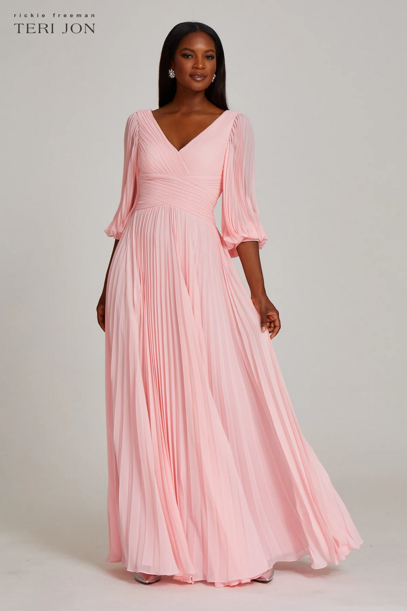 Teri Jon Pleated Chiffon Puff Sleeve Evening Dress 209098