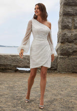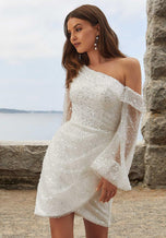 For our brides who love to sparkle. Our Nova designer wedding dress glitters in allover pearl and crystal beaded net. The asymmetric neckline has an effortless feel leading to sheer beaded bishop sleeves that highlight the celestial sparkle. The sparkle features a wrap detail that adds visual interest to the dress. Shown in Ivory.
