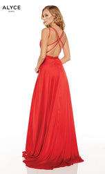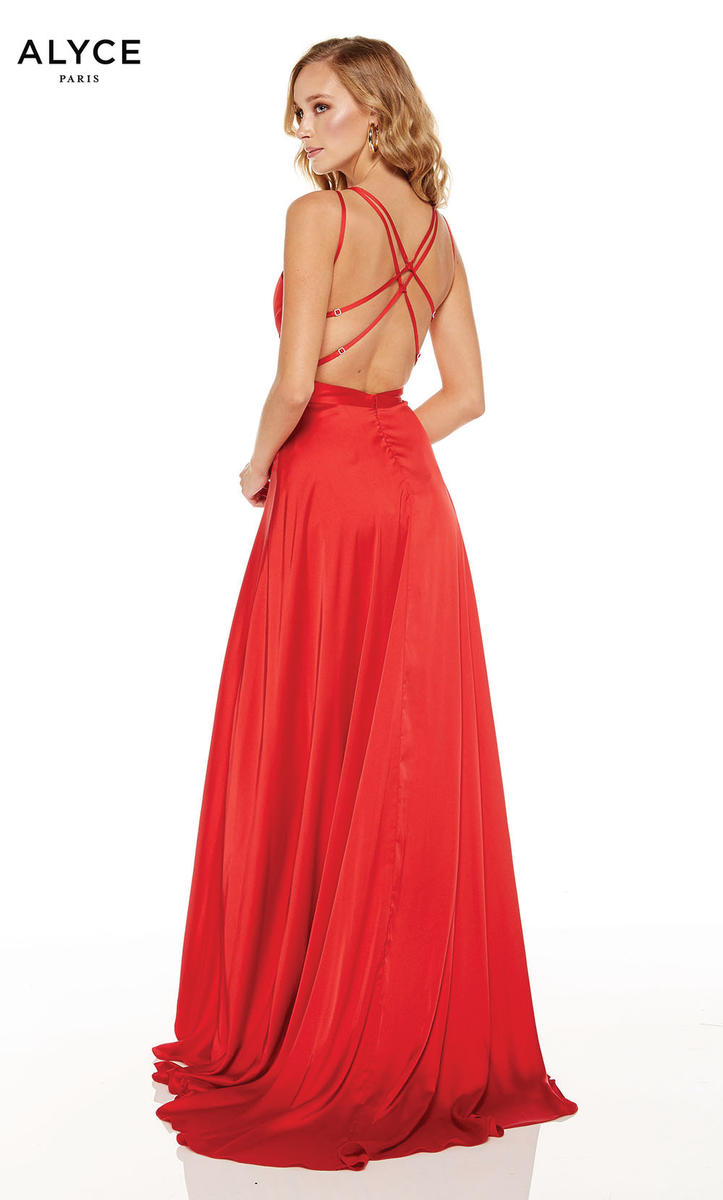 Bright, Bold, Sexy,, you name it girl! This stunning long chiffon aline gown is designed by Alyce Paris. 1516, showcases a v-neckline, side cutouts, thin doubled traps that create an eye-catching crisscross back. A flowy satin skirt with a leg slit! Perfect fro a ball or Christmas party