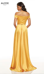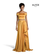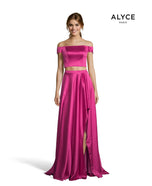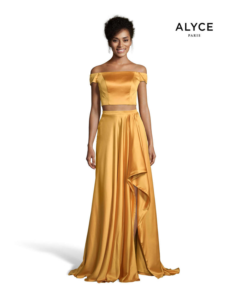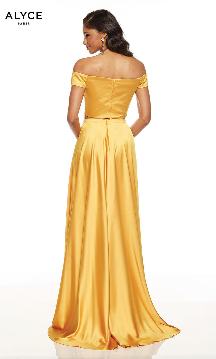 WOW, just WOW! This Two-piece gown is perfect for any special , social occasion! 1529, features a fitted crop top with an off-the shoulder neckline and cap sleeves. A mesmerizing satin A-line skirt with side gathers and slit from The secret Dress by Alyce Paris.
