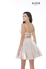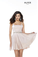 This super sweet and dazzling short cocktail gown is perfect fro any Fall event of Family gathering! 1576, has a scoop neckline, thin straps and an eye-catching open lace-up back! The shimmer satin gown is completed with a beaded belt a flowy layered skirt.