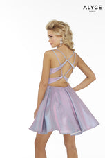 Super cute is this iridescent short aline gown made in metallic fabric by Alyce Paris. 1591, showcases a v-neckline with thin straps and an open crisscross back. This gown is perfect attire fro Hoco, Guest of or night out.
