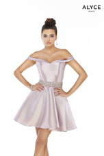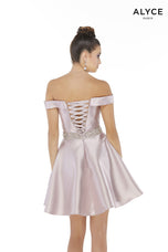 This short aline mikado gown is perfect for any age!1599, is designed from The Secret Dress by Alyce Paris and showcases an off-the-shoulder sweetheart neckline with thin cap sleeves. An eye-catching open lace-up back. The gown is completed with a beaded belt and pockets! This is perfect fro Guest of, Damas or Fall event.