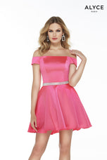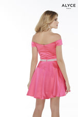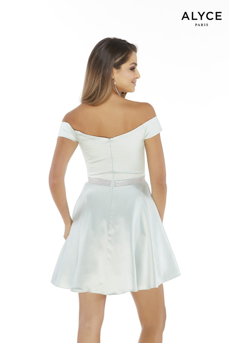 A touch of sassy in this gown is perfect! 1601, is designed from The secret Dress by Alyce Paris and features an off-the-shoulder neckline with cap sleeves. The aline gown is made in satin fabric and is finished off with a beaded belt and flowy skirt. Perfect fro Homecoming, Damas or School dance