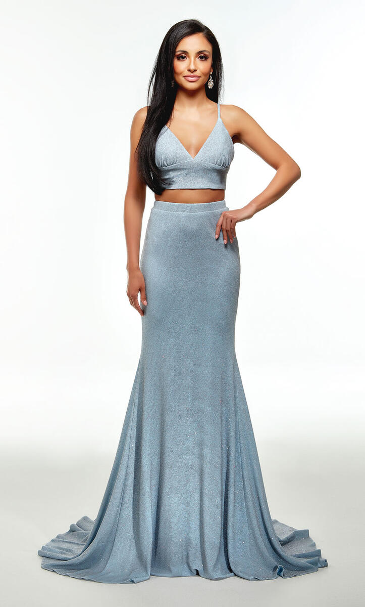 Sparkle, Sparkle, Sparkle! This Two-piece long fitted gown is the one for you! 1687, is from The Secret Dress by Alyce Paris and features a fitted crop top with a v-neckline, thin straps and open cutout back! The fitted skirt that will hug your figure and a sweep train that is finished off with horsehair hem for volume! Perfect attire for a Ball or Hoco.