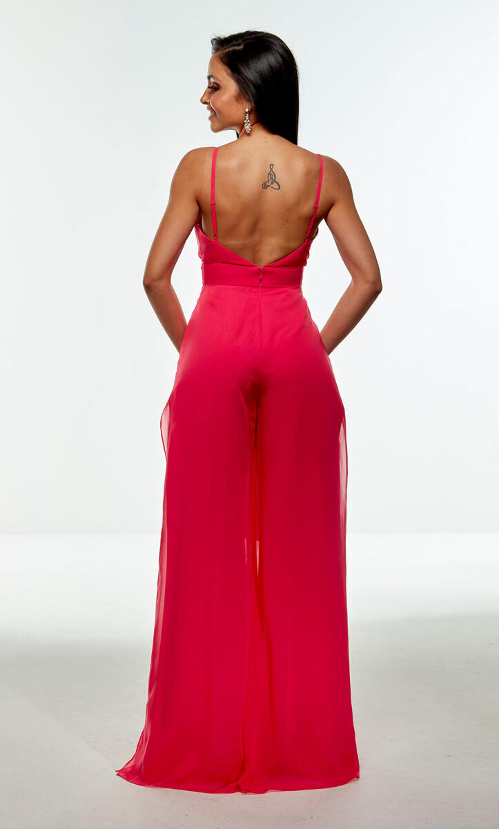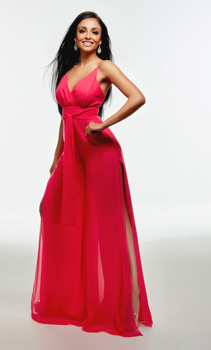 Be picture ready in this stunning long chiffon jumpsuit gown designed from The Secret Dress by Alyce Paris. 1692, showcases a v-neckline, thin adjustable straps and low back. The jumpsuit is made in delicate chiffon fabric and is completed with a thick band with straps that can be made into a lovely side bow! Make this your attire fro a night out or school formal!
