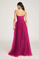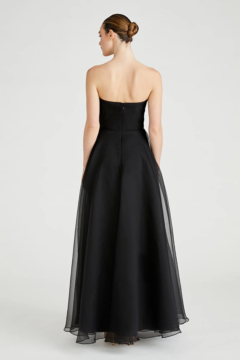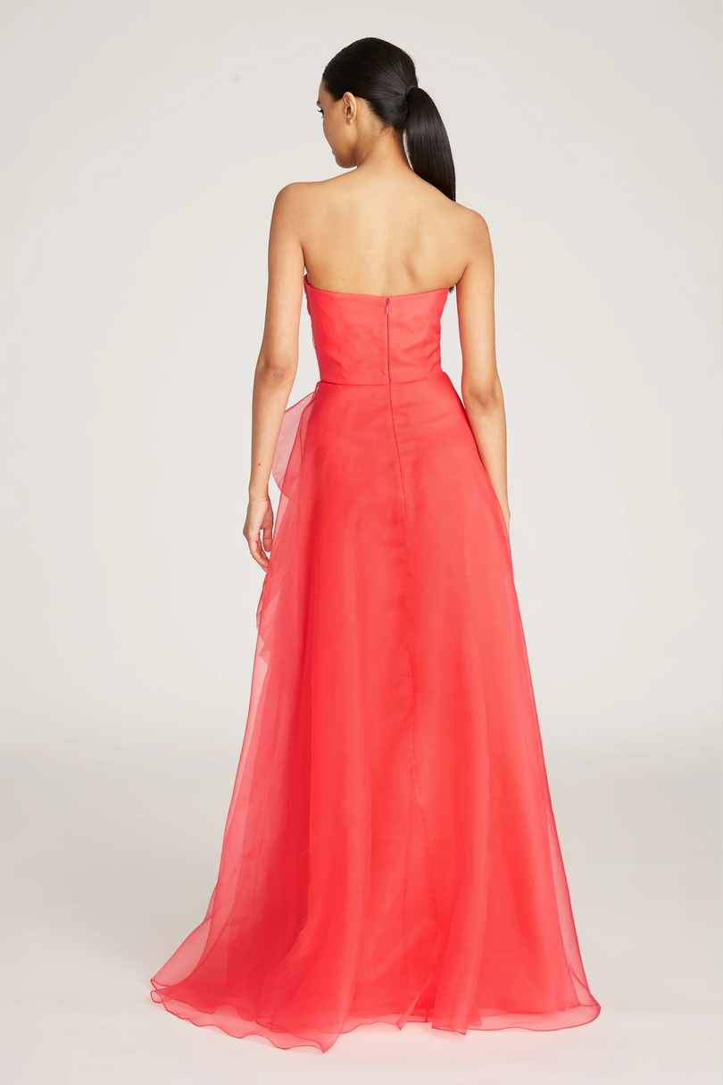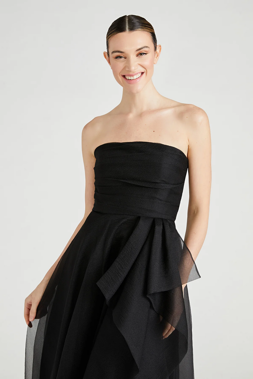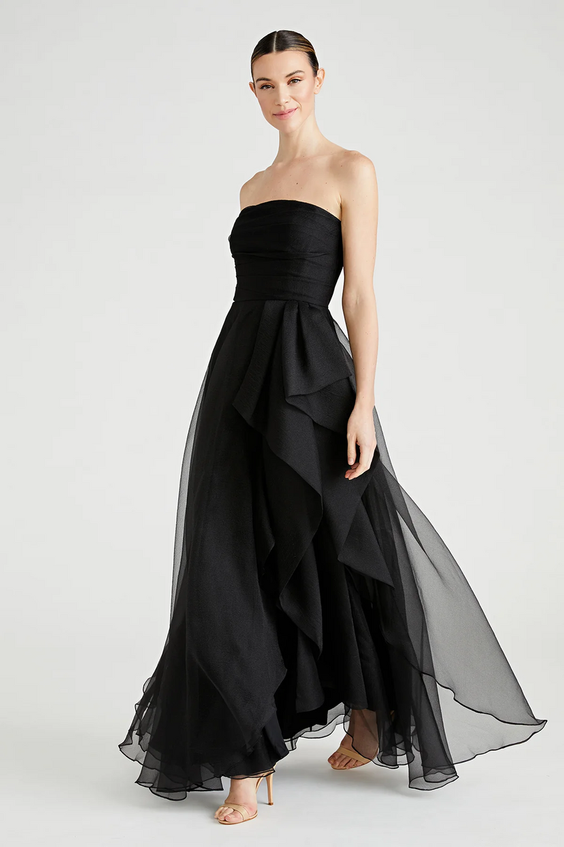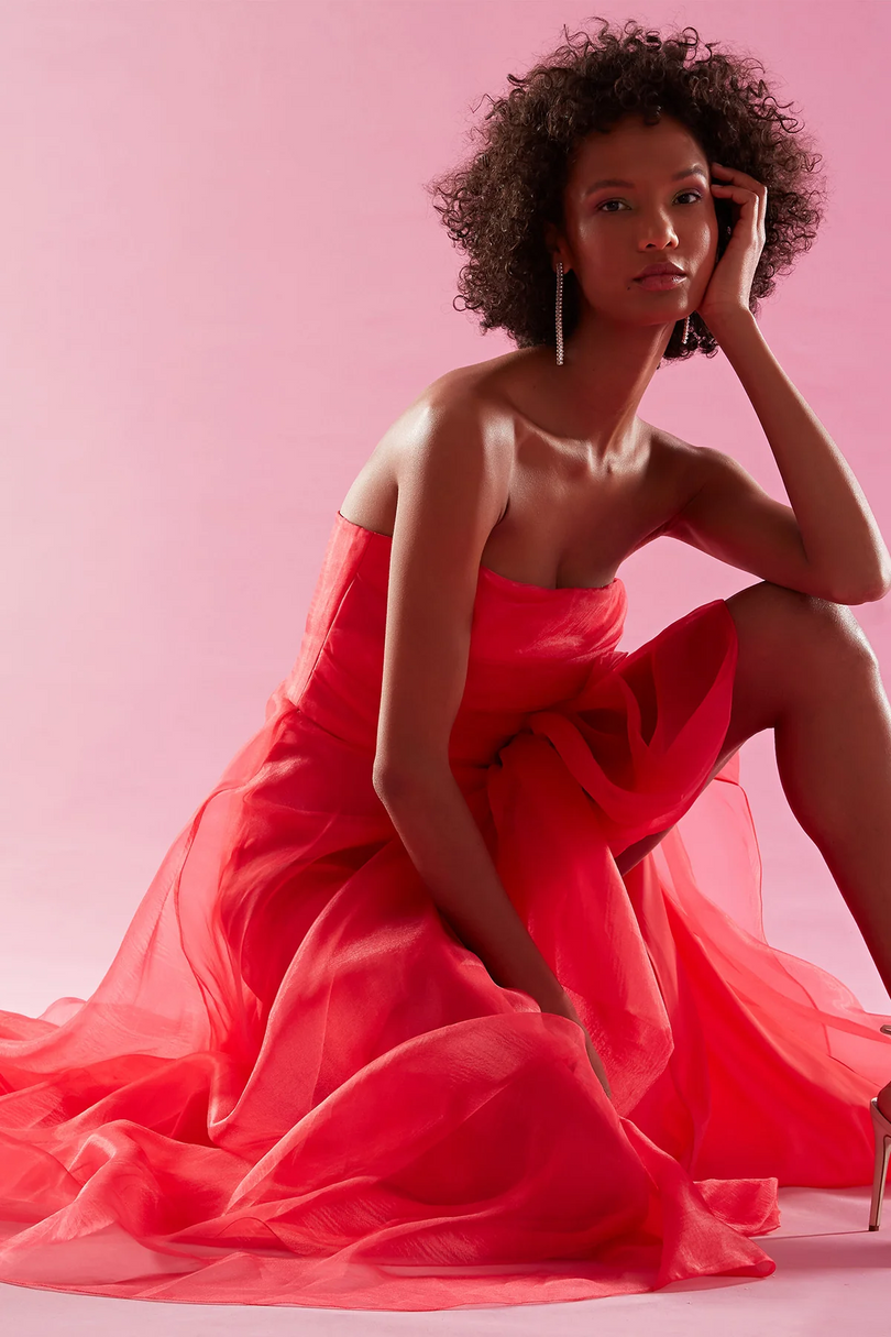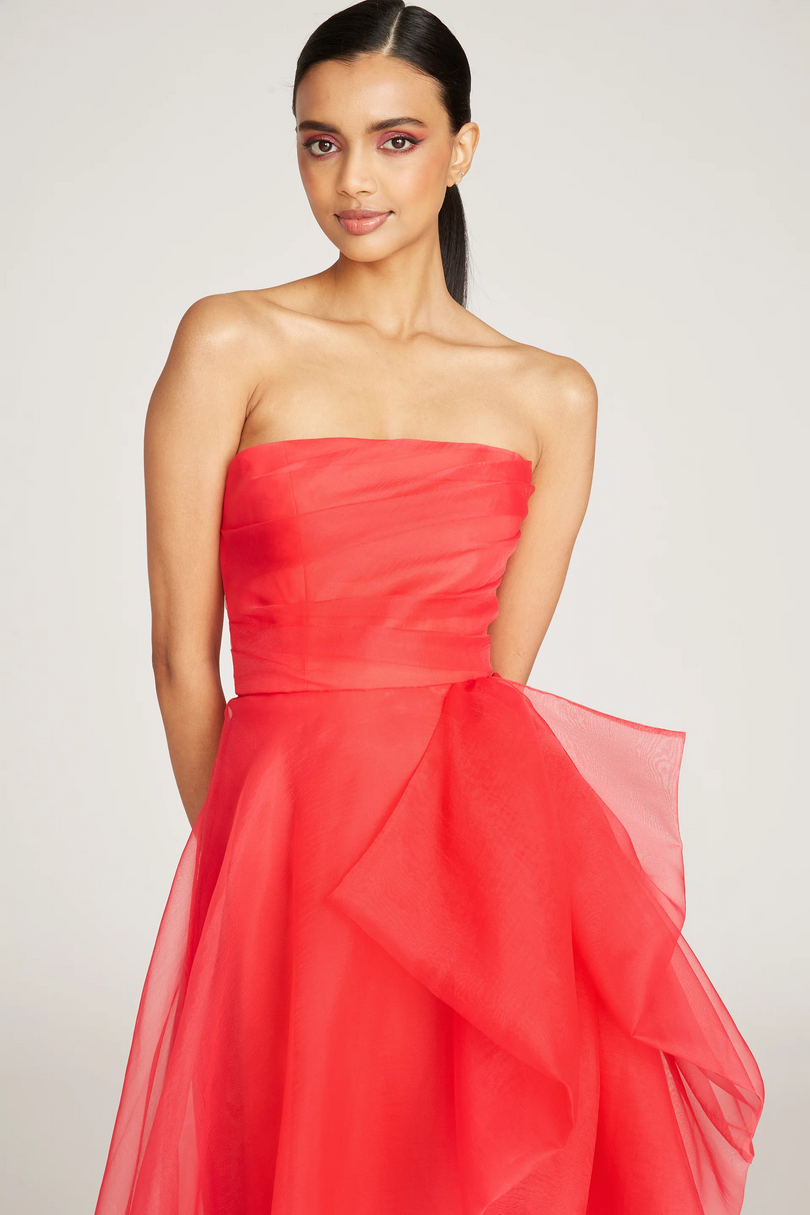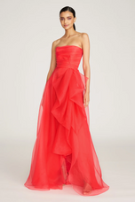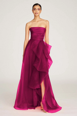 The Teresa gown is sculpted in pebble organza—a weightless and high-quality fabric woven to give your style movement and bounce. This radiant piece comes strapless and features a draped bodice, front slit accent, and a cascading ruffled skirt. This item is a final sale. No Returns or Exchanges.