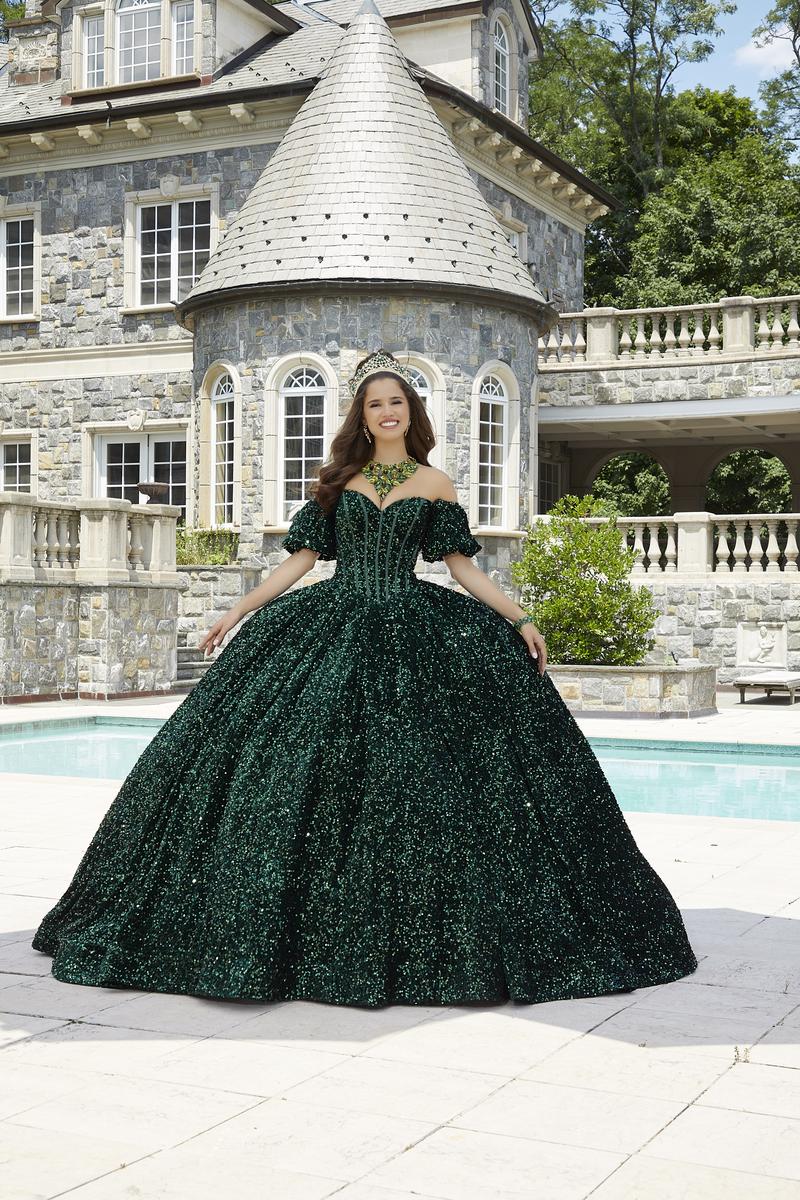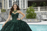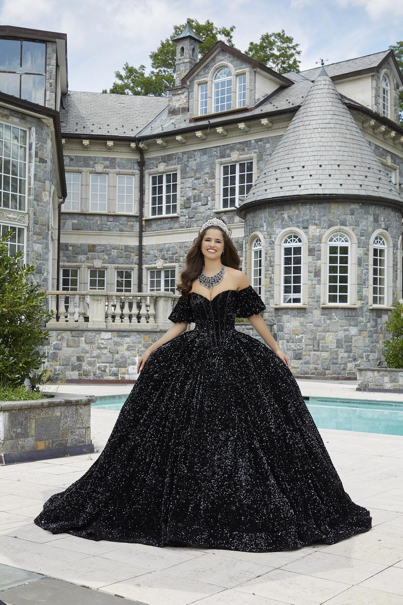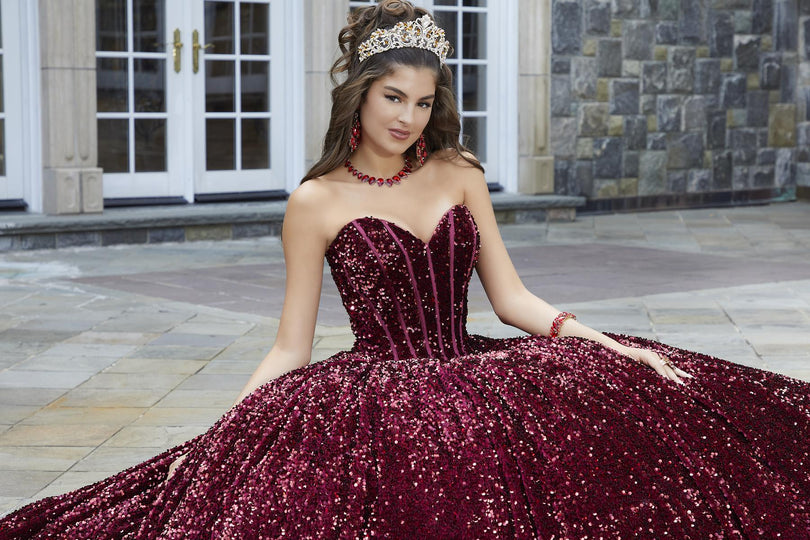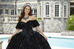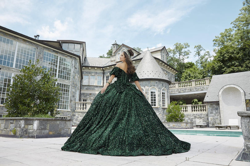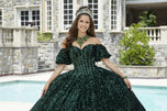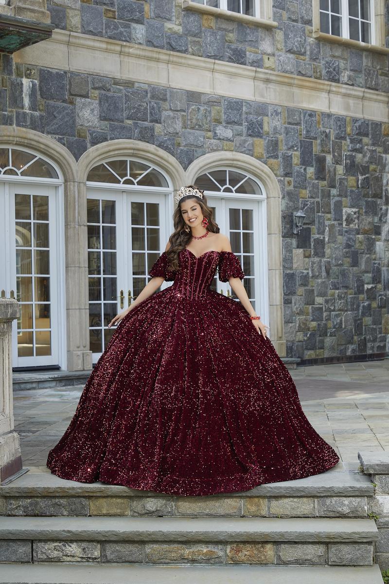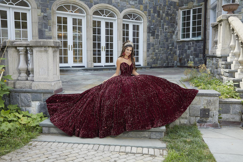 Glittering quinceanera ball gown sparkles in allover sequined velvet on a corset bodice with sleek satin boning and romantic sweetheart neckline. Detachable pouf sleeves add a touch of whimsy to the look.