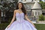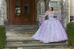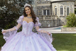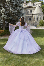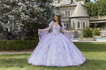 Fairytale quinceanera ball gown has a draped, sweetheart bodice adorned with delicate crystal beaded, three-dimensional floral appliques that cascade down the glitter tulle skirt. Detachable princess sleeves and back bow complete the look.