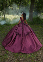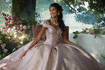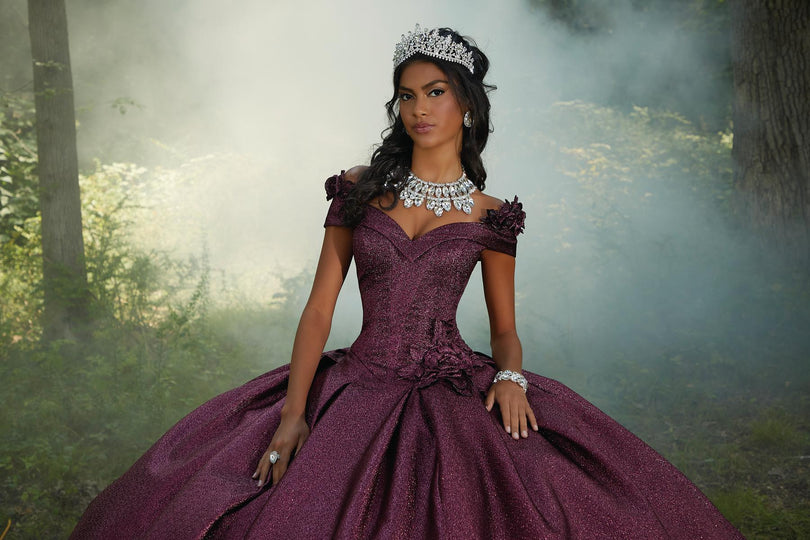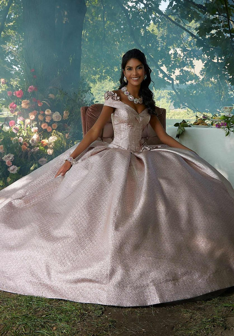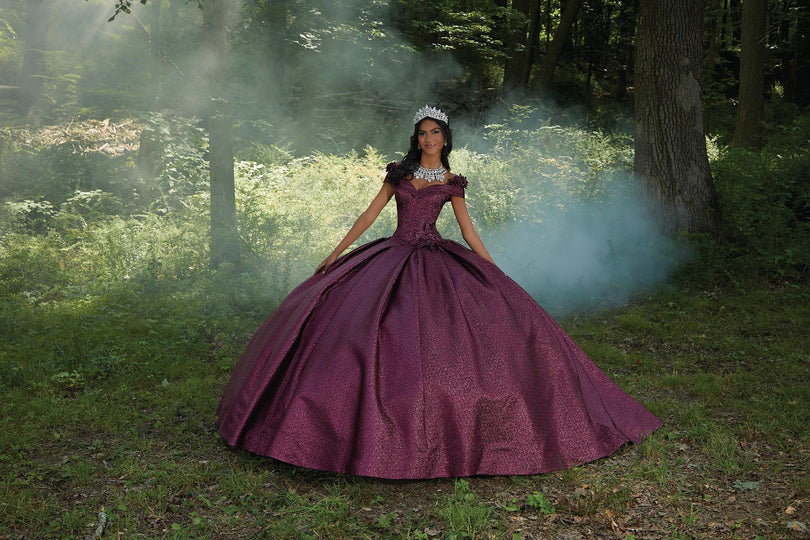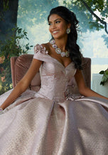 Morilee Style 60196 is a grand Quinceaera ball gown that exudes timeless elegance. The structured bodice, accentuated by contoured seams, features a charming cuffed off-the-shoulder neckline and a defined basque waist. Delicate three-dimensional flowers adorn the bodice, adding a touch of romanticism. The gown's unique pleated shimmer fabric creates a mesmerizing glow and a luxurious texture as it cascades into a voluminous skirt. A sweet bow embellished with three-dimensional flowers graces the back of the dress, adding a playful touch. A matching stole completes this exquisite ensemble, making it perfect for a Quinceaera who desires a sophisticated and unforgettable look.