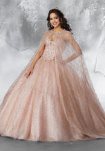Sparkle the night away in this stunning Vizcaya Quinceaera gown style 89199 by Mori Lee. This strapless sweetheart gown has a pearl and beaded bodice with an adjustable lace-up back. A full patterned glitter tulle skirt is the cherry on top of this fabulous style! Matching bolero jacket included. Cape sold separately as style 89201.