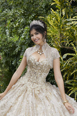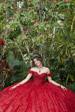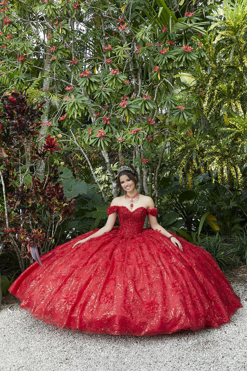 Showcase this Enchanting Quinceaera ballgown on your special night! This Mori Lee Vizcaya 89289 red quince gown features a off-the-shoulder straps edging the sweetheart neckline and an adjustable lace-up back. Crystal beadwork and 3D lace appliques embellish this basque waist ballgown, finished with a matching bolero jacket for cover! A sweep train that will sway with every step that you take!