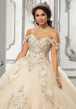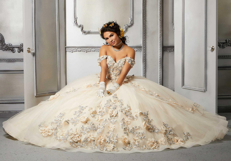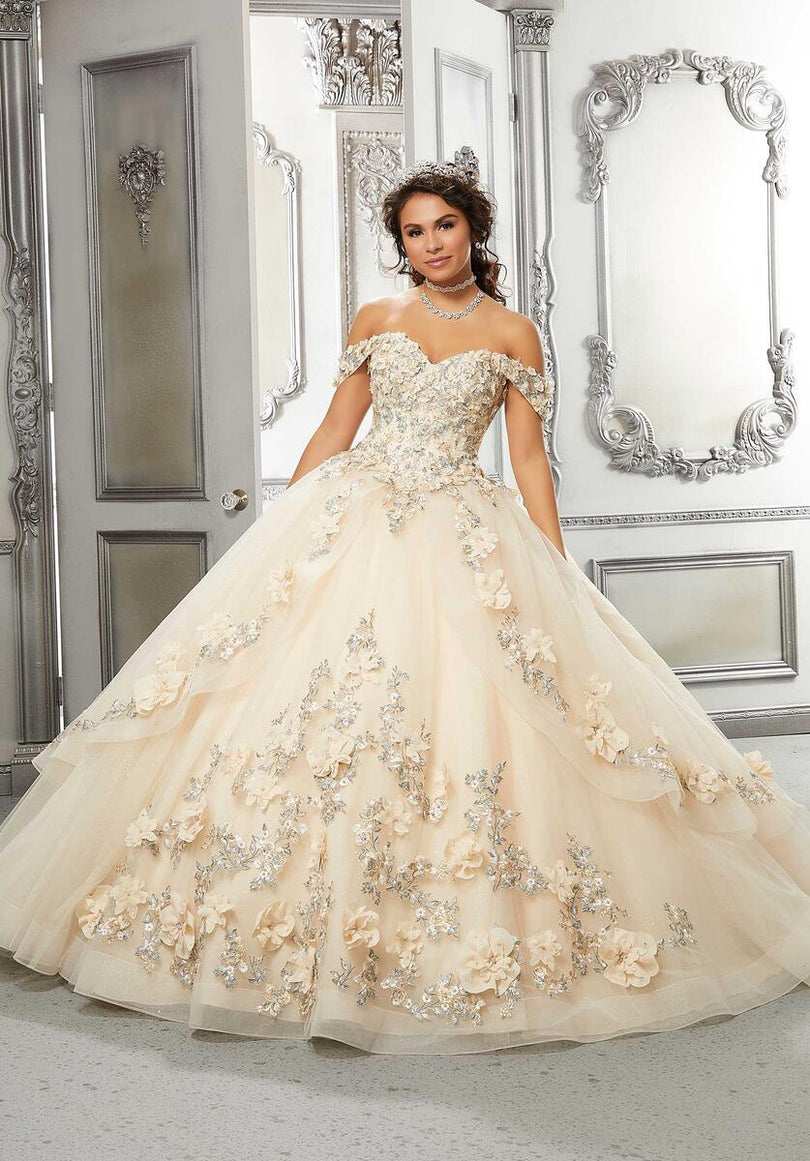 A floral fantasy Quinceanera ball gown featuring delicate crystal beaded, three-dimensional floral appliques all designed by Morilee Vizcaya. 89318, is made with contrasting embroidery cascading down from the off-the-shoulder, sweetheart bodice to the full princess tulle over glitter tulle skirt that will sway with you!