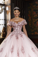 Have a magical night in this lovely tulle over glitter net quince ballgown from Valencia by Morilee.89333, showcases a flounced, off-the-shoulder neckline, sparkling caviar, and crystal beaded appliques with 3-D floral detailing. A gorgeous, scalloped skirt back with a stunning oversized bow!