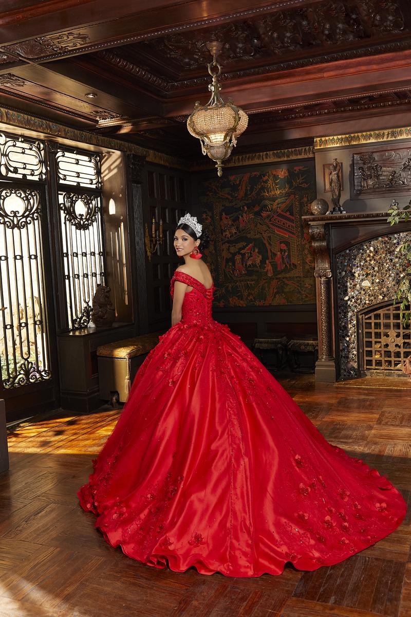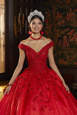 Look and feel like royalty in this mesmerizing ballgown from Morilee by Vizcaya. 89337, showcases classy off-the-shoulder v neckline. A unique touch of three-dimensional floral appliques cascading down the airy tulle satin skirt. Finished with floral appliques and a sweep train that will sway with every step that you take! Perfect for your Quinceanera night!