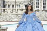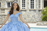 Stun the crowd in this quinceanera ball gown created by Morilee Vizcaya, style 89411. The gown has a has a draped off-the-shoulder neckline with decadent crystal beaded lace appliques cascading down the sparkling patterned glitter tulle skirt. Detachable bishop sleeves, in matching patterned tulle add a whimsical touch to the dress! This is absolutely the one for you! Dont miss out on this gem!
