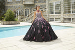 Wednesday Addams approved! This Gorgeous quinceanera ball gown created by Morilee Vizcaya, style 89415, has breathtaking crystal beading, contrasting ombre embroidery cascading down from the sweetheart neckline to the glitter tulle skirt. Get two looks in one with detachable ruched gauntlet sleeves and a back bow! Perfect for your special day!