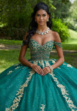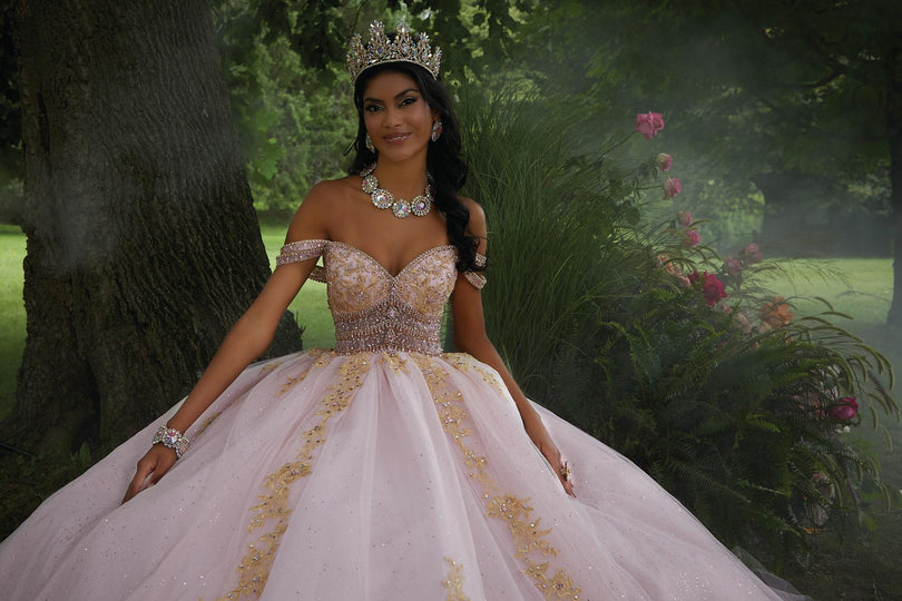 This exquisite quinceaera ball gown exudes sophistication. A strapless bodice, accented with a dazzling band of rhinestones, complements the sheer boned structure for a touch of elegance. Detachable off-the-shoulder sleeves offer two stunning looks in one. Cascading crystal beadwork adorns the sparkling tulle skirt, drawing attention to the beautiful back bow that completes this unforgettable ensemble. A matching stole adds a touch of regal flair!