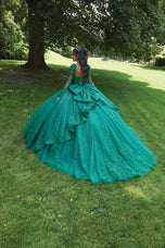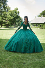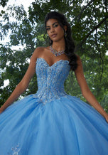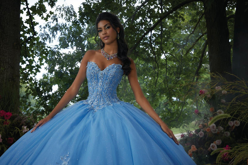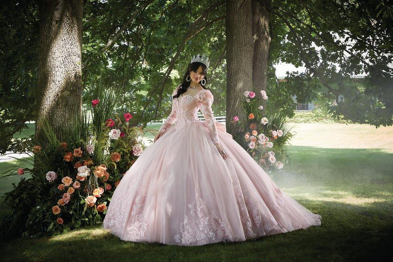 This timeless quinceaera ball gown embodies elegance and sophistication. The structured corset bodice features stunning three-dimensional floral embroidery, accented with delicate crystal beading, that beautifully highlights the strapless sweetheart neckline and basque waist. Shimmering sparkle tulle adds a touch of magic, with embroidered details that dance throughout the full skirt. For a touch of whimsy, a detachable back bow and long pouf sleeves add a touch of whimsy and versatility. A matching stole completes this unforgettable look!