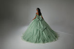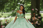 Glamorous quinceanera ball gown has an off-the-shoulder bodice with a sheer midriff exposing the couture boning. Crystal beaded, three-dimensional floral embroidery decorates the bodice and cascades down the gorgeous sparkel tulle skirt. We love the look of the sheer off-the-shoulder sleeves and the sweet detachable back bow that adds drama to the dress. Matching stole included.