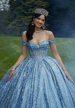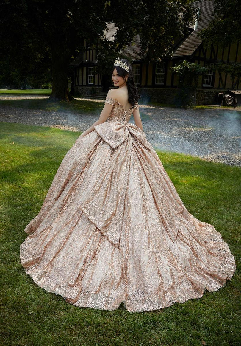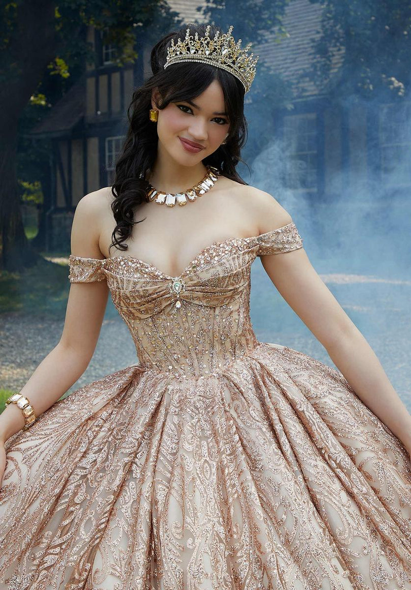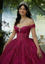 Embrace the magic of your quinceaera in this enchanting Vizcaya ball gown (style 89455). The off-the-shoulder bodice is crafted from a subtly sheer fabric, offering a touch of ethereal beauty. The bust is delicately draped, highlighting your unique silhouette, while peek-a-boo jewel beading adorns the lovely sweetheart neckline, adding a touch of sparkle.The real magic unfolds in the skirt, made from intricately patterned glitter tulle. This luxurious fabric boasts an unreal sparkle that will catch the light with every move. A beautiful brooch adorns the center of the bodice, further enhancing your radiant shine. To add a touch of drama and whimsy, the dress features an oversized, detachable back bow. This allows you to personalize your look and create a truly unforgettable entrance.To complete your regal presence, a matching stole is included. This gown is a perfect blend of subtle elegance and dazzling sparkle, making you feel like the quinceaera queen you are!