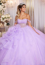 Glamorous ball gown has a modified sweetheart neckline on a sheer, crystal beaded corset bodice with a large 3D rosette floral cascade on glitter tulle.