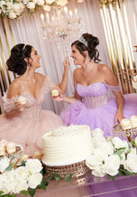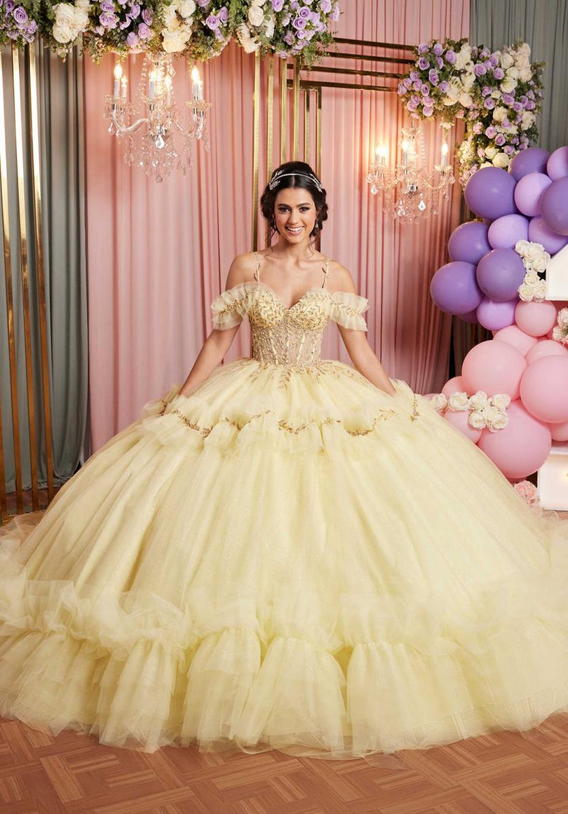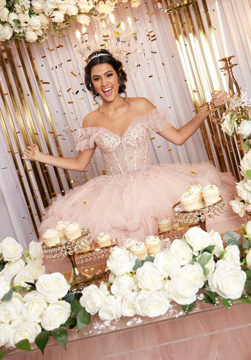 Beautiful ball gown has an off-the-shoulder sweetheart bodice with ruffled sleeves, exposed boning, and crystal floral embellishments on a tiered ruffle glitter tulle skirt.