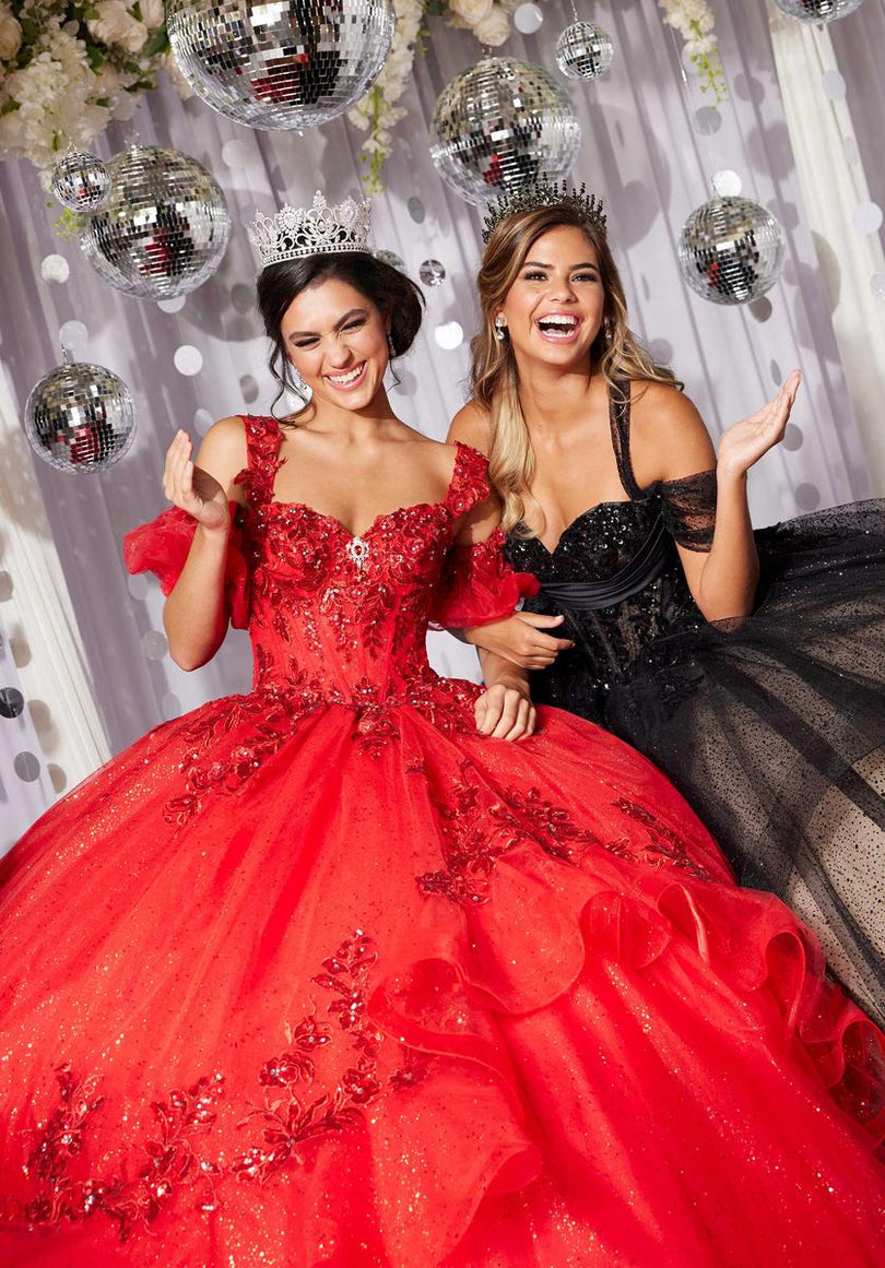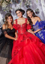 Dramatic ball gown has a boned sweetheart bodice with embroidered crystal appliqus on an asymmetrically flounced glitter tulle skirt with detachable straps, pouf sleeves, bow, and train.