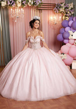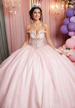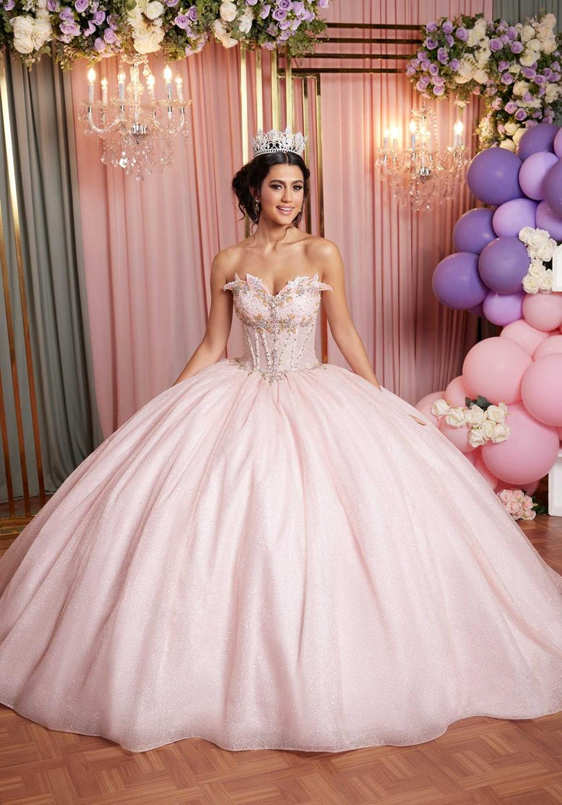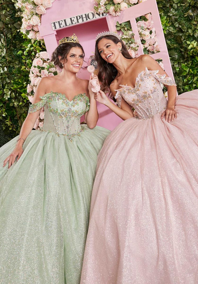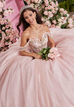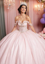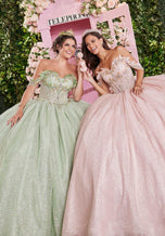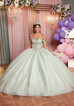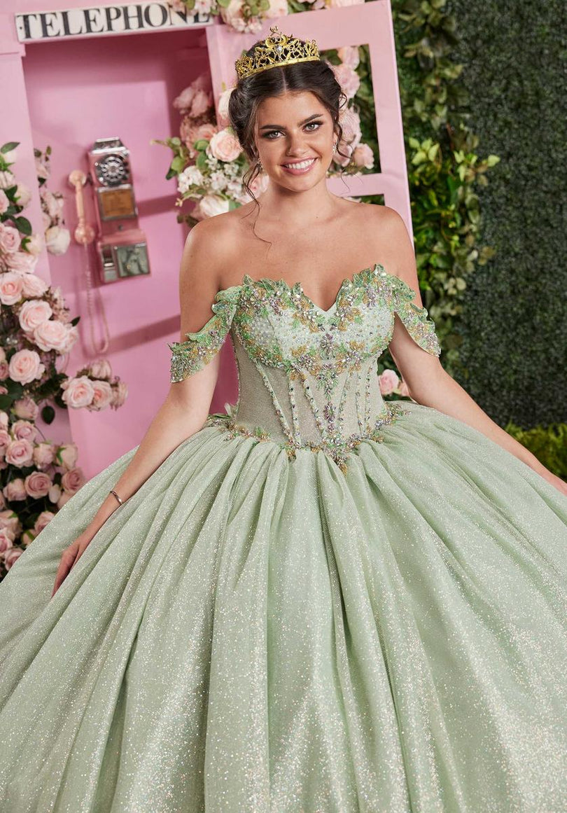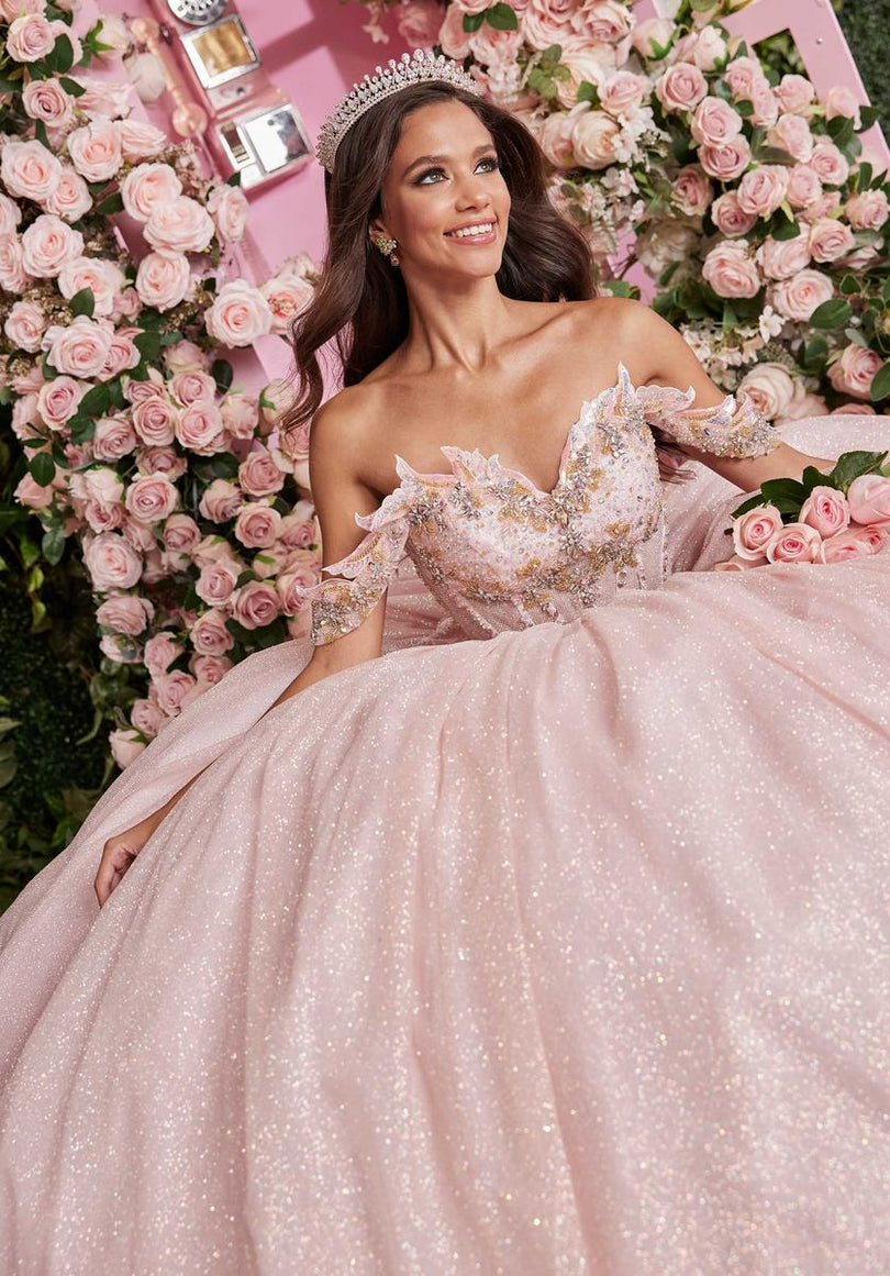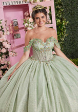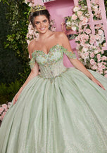 Fairytale ball gown has a stylized scalloped, sweetheart neckline with crystal beading on a glitter tulle skirt with a pickup back bustle, 3D florals and detachable off the shoulder sleeves.