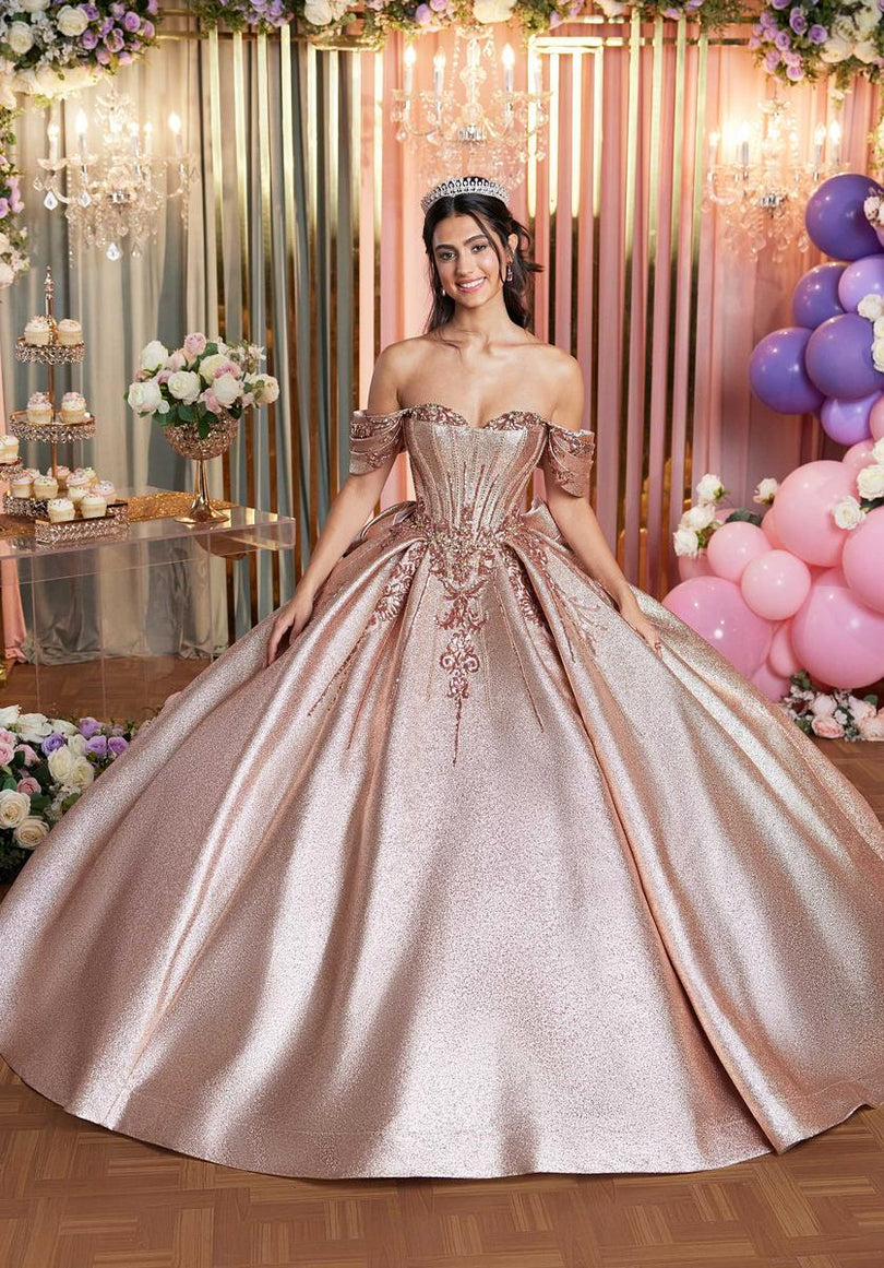 Glowing metallic brocade ball gown has a sweetheart neckline on a crumb catcher corset with sequin embroidered appliqus, back bow, and detachable off-the-shoulder sleeves.