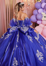 Beautiful ball gown has a boned, cat eye bodice with embellished appliqus on soft shimmer satin and tulle with a peplum tiered skirt with detachable pouf sleeves and bow.