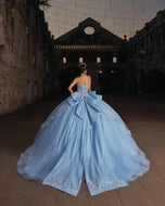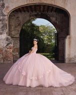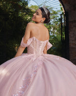 This beauty is names Ava and serves classic quince beauty featuring a sweetheart neckline adorned with a sparkling crystal brooch, while boning detail and a sheer midriff wrapped with delicate tulle. The corset back leads to a floral applique peplum skirt layered over glitter tulle, adding whimsical texture and sparkle. Detachable off-the-shoulder sleeve drapes offer graceful versatility, and a double-loop cascading ruffle bow with trailing tails completes the look with elegant drama. Once you try this gem on, you will absolutely fall in love!